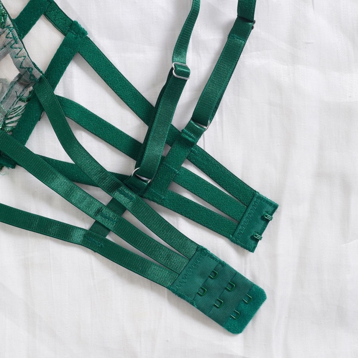 • Le Soutien-gorge Corbeille : Sa coupe à armatures offre un maintien structuré tout en créant un décolleté gracieux. Les détails de broderies bleues et jaunes encadrent délicatement la poitrine, tandis que les bordures festonnées ajoutent une touche couture irrésistible.