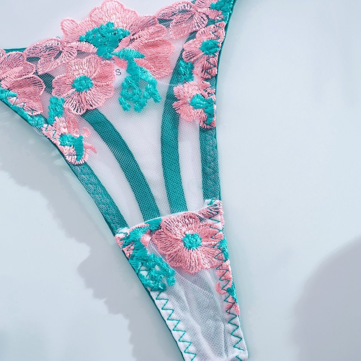 Cet ensemble est une véritable prouesse de design, mêlant l’esprit d’un corset vintage à la légèreté de la lingerie moderne. Le bustier longline, entièrement transparent, est paré de broderies florales jaunes vibrantes et de tiges vert tendre qui semblent grimper sur le corps. Une création lumineuse qui sublime la silhouette avec une structure sophistiquée et une fraîcheur printanière.